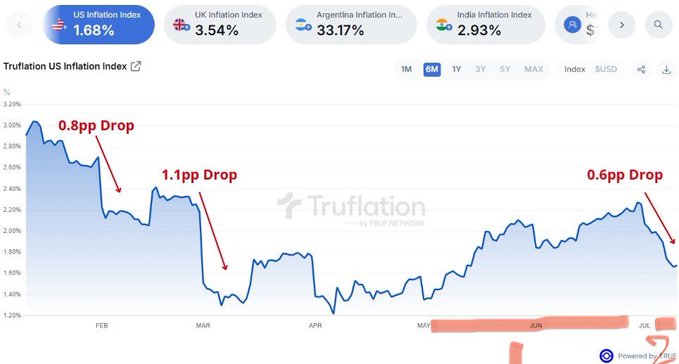 關於Truflation上的實時通脹數據有兩點疑惑?1、為何truflation上面的顯示的美國通脹數據只有1.68%,是剔除掉住房通脹數據麼?歐洲的通脹數據是不包含業主等價租金的,美國cpi裡業主等價租金佔據權重很大(佔cpi接近25%的權重,住房通脹的75%),如果剔除業主等價租金後BLS的cpi數據應該低於2%了。 2、truflation的通脹數據是實時,看不少觀點認為truflation的通脹數據比BLS的cpi數據要提前45天,7月以來truflationg通脹數據下降,但是往回看5月和6月數據則是上漲的,這是預示有有一個一次性的反彈麼?如之前聊到的x.com/qinbafrank/status/192242...… 歡迎有關注或者熟悉truflation機制的朋友一起聊聊這塊。