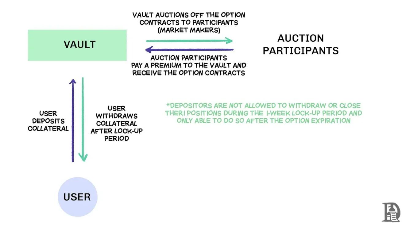 2021 年初,去中心化期權金庫(DOVs)出現。Ribbon Finance 開創了這種模式,策略很簡單:用戶將 ETH 存入金庫,每週五通過鏈下拍賣賣出備兌看漲期權。做市商競標訂單流,權利金作為收益返還給存款人。每週四期權結算、抵押品解鎖後,整個流程重置。