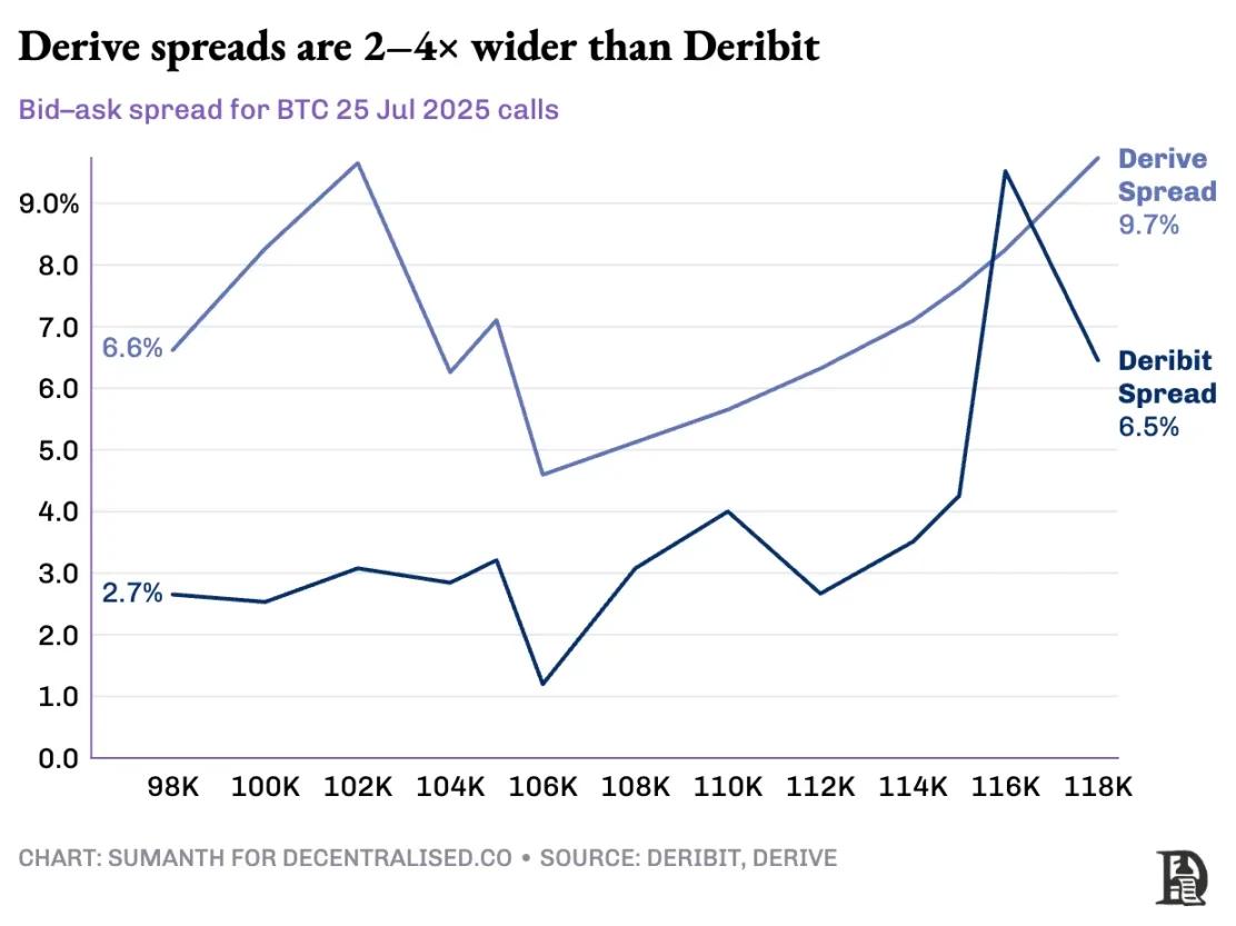 鏈上協議在將每份行權價和到期日代幣化到各自的 ERC-20 代幣庫中時,就打破了這種循環。下週五鑄造的 12 萬看漲期權無法識別 BTC 永續合約的對沖。雖然 Derive 已通過在其清算所內添加永續合約來實現跨保證金,部分解決了這個問題,但價差仍然遠高於 Deribit;同等倉位的價差通常要高出 2-5 倍。
