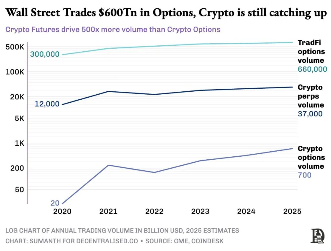 但加密貨幣衍生品的情況截然不同:永續合約每月交易量約 2 萬億美元,是期權(每月約 1000 億美元)的 20 倍。加密貨幣市場沒有繼承傳統金融的現有模式,而是從零開始構建了自己的生態系統。