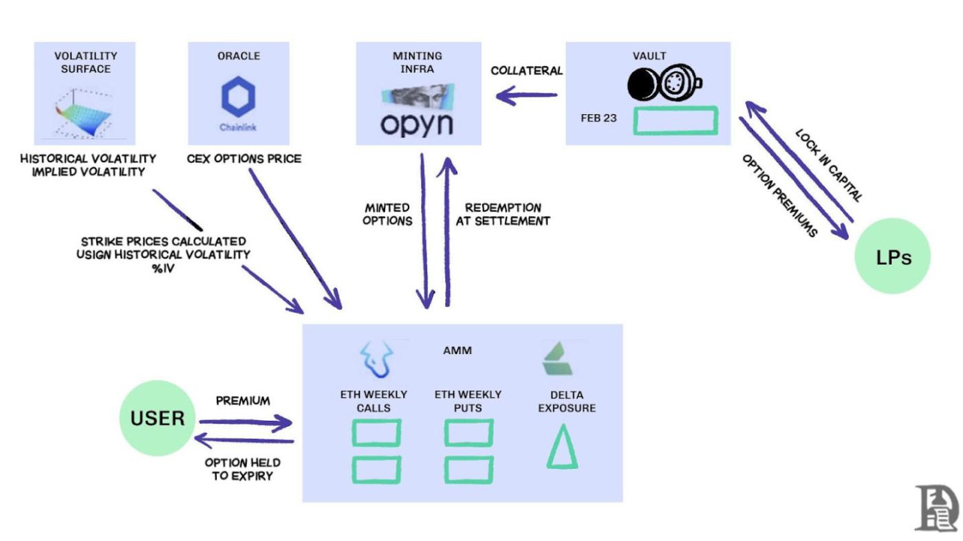 對用戶來說,這幾乎是魔法:一筆交易完成,無需對手方,權利金流向 LPs(扣除協議費用)。交易者喜歡一鍵操作的體驗,LPs 則喜歡收益;金庫可以同時發行多個行權價 / 到期日的期權,無需主動管理。