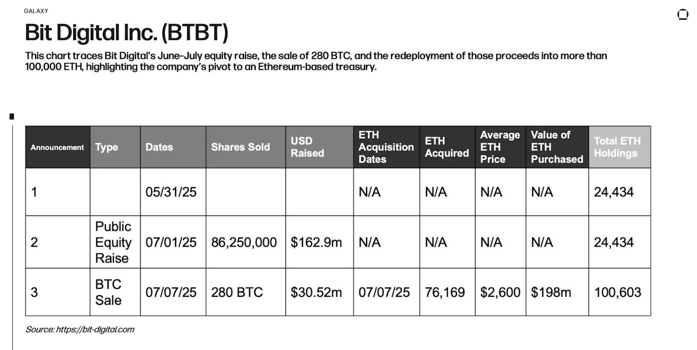該圖表追溯了 Bit Digital 在 6 月至 7 月的股權融資、280 枚比特幣的出售,以及將這些資金重新配置為超過 10 萬枚以太坊的全過程,凸顯了公司向以以太坊為核心的資金儲備模式的轉型。