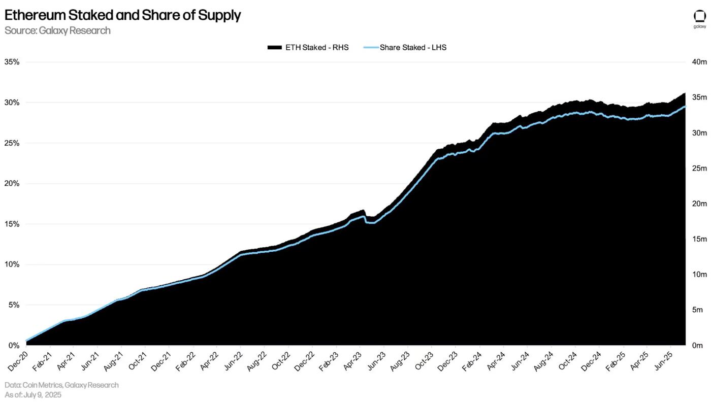事實上,截至 7 月 9 日,以太坊質押量已達歷史峰值(超 3500 萬枚,佔總供應量 30% 以上),以太坊儲備公司的興起或許是推動這一趨勢的重要原因之一。