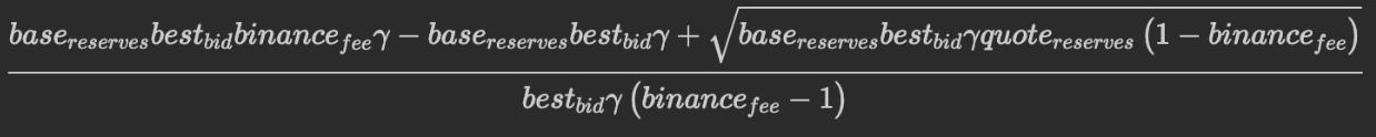 一個勉強具有競爭力的統計套利機器人所需的最後一個要素是計算訂單規模以最大化利潤的算法。如果我們假設既不會下單超過中心化交易所(CEX)訂單簿的頂層深度,又像我們最初那樣交易 Uni V2風格的去中心化交易所(DEX)池,那麼可以推導出一個不錯的解析解(推導過程省略,因為如今這兩個假設都非常不現實)