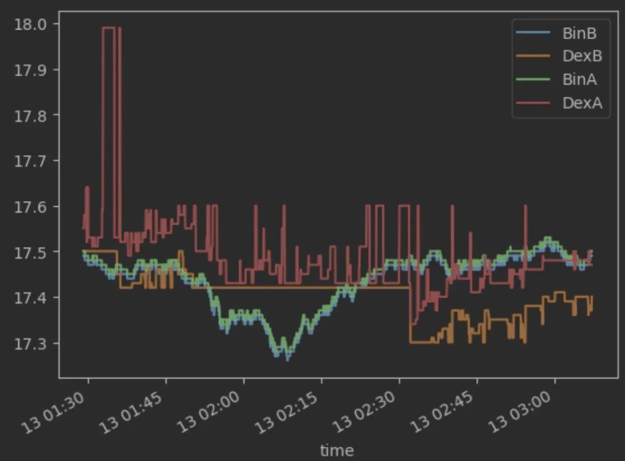 如果還不明顯的話,我們的機器人現在變得相當複雜。最初只是一個簡單的 Python 腳本用來執行簡單交易,現在已經發展成一個非常複雜的系統。是否可以通過只交易 DEX 端來簡化?大約 80% 的時間價格發現起源於 Binance.