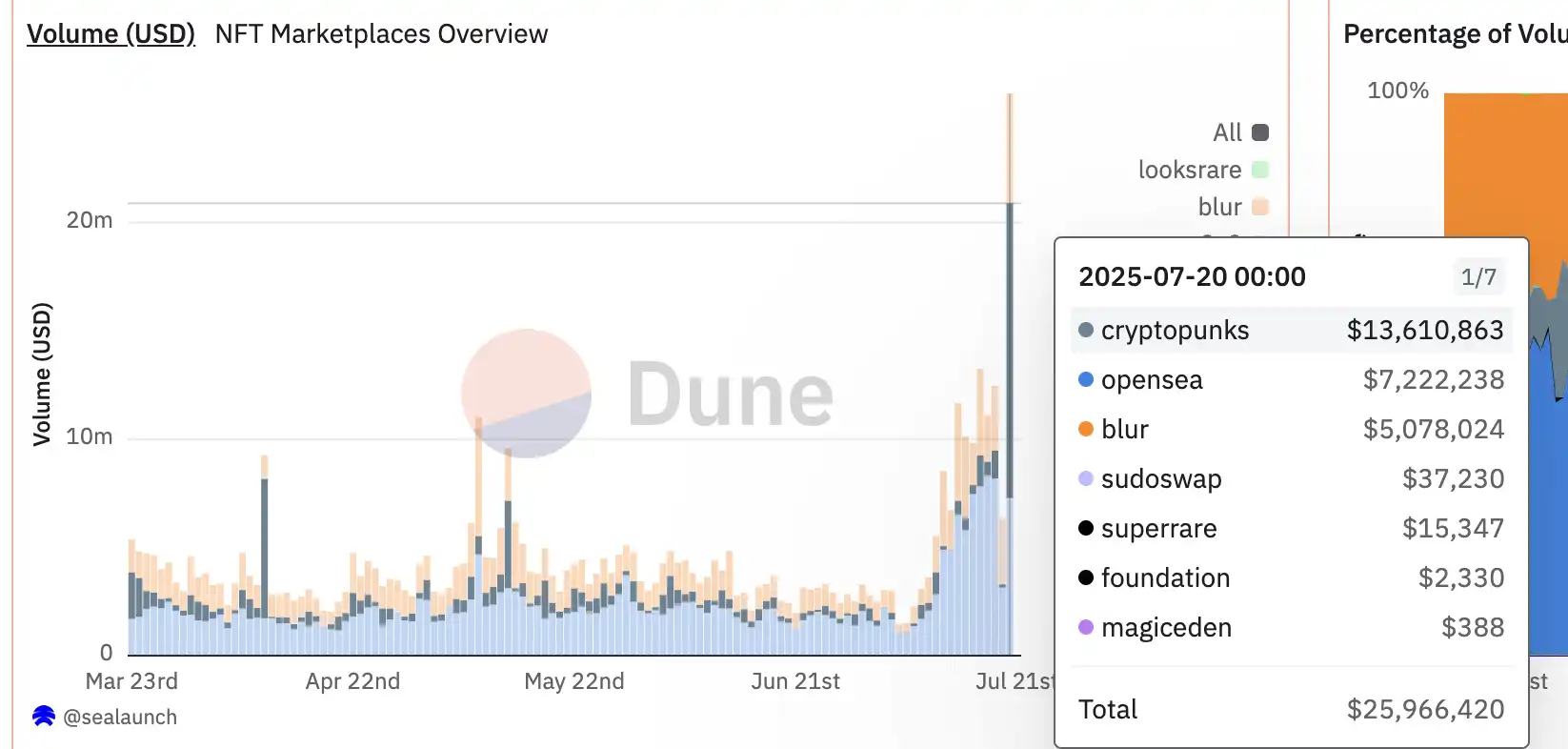 4 年後,2025 年的 7 月,「0x1bb」花費約 800 萬美元一口氣掃了 46 個 Crypto Punks。在 ETH 逐漸逼近歷史前高點的當下看見「Punk Sweep 2.0」,實在是有一種時代輪迴的宿命感。