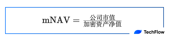 如前所說,NAV 的重點是反映公司當前的淨資產(大部分是加密資產)狀況,而不涉及市場對這些資產的預期;而 mNAV 是一個更具市場導向的指標,用於衡量公司市值與其加密資產淨值的關係。其計算公式為: