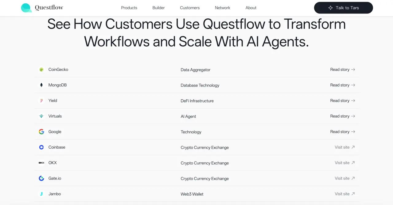 據官方信息,Questflow已與多個領域的頭部平臺建立合作關係,包括交易所(Coinbase、OKX、Gate)、穩定幣(Circle)、數據分析(MongoDB、CoinGecko)、AI Agent平臺(Virtuals、Yield)、Web3手機(Jambo)、 Web2 企業(Google)等。