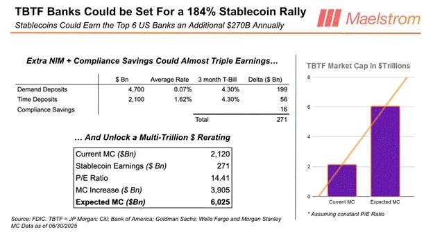 Bruce(@zbreezea)在其《穩定幣背後的利益交換》一文中闡述,一旦由美國銀行巨頭親自發行穩定幣,將能釋放出高達 6.8 萬億美元的國債購買力,以摩根大通發行穩定幣JPMD為例,摩根大通不再需要大量合規、審計、風控、操作崗位;不用再守著一堆 9 點到 4 點半的老系統;區塊鏈智能合約自動轉賬、自動結算,所有流程都能重構。每年省下200 億美元的合規成本。如果穩定幣邏輯跑通,這些銀行巨頭們的股價平均將上漲 184%。