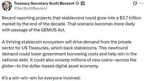 鑑於美元穩定幣一家獨大,討論穩定幣未來的發展趨勢離不開美國政府的政策態度。自特朗普當選總統後,其任命斯科特·貝森特擔任財政部長,大衛·薩克斯(加密沙皇)任白宮人工智能和加密貨幣政策主管,宣佈建立比特幣國家戰略儲備,特朗普對待加密資產的態度與拜登截然相反。如果說因為特朗普利用加密貨幣大賺特賺似乎也能解釋。但參議員比爾·哈格蒂在2025年2月4日提出《GENIUS法案》後,參議院以68票對30票迅速通過該法案,該法案將交由眾議院審議,簡直一反常態,要知道參議院可是有非常多的民主黨成員,而拜登也屬於民主黨,民主黨一直不喜歡加密資產,但共和黨與民主黨確在《GENIUS法案》這一問題上達成共識,恨不得立即生效。究其原因,美國財政部沒錢花了,更重要的是沒錢付美債利息了,不管是共和黨還是民主黨當選總統,都要面臨這個政府沒錢花的窘境。而《GENIUS法案》一旦通過,基於100% 儲備資產的強制要求,這意味著每發行 1 美元穩定幣,發行方需向託管機構存入 1 美元現金或購買 1 美元美債,形成 “發行 - 儲備美債” 的閉環,用戶購買穩定幣的資金最終轉化為對美債的市場需求,進一步擴大美債規模,壓低短期美債收益率,降低美國政府的利息支出,同時為財政部帶來更多的財政支出預算。在如此天大好處面前,共和黨和民主黨都是受益方,自然沒有理由阻擾。