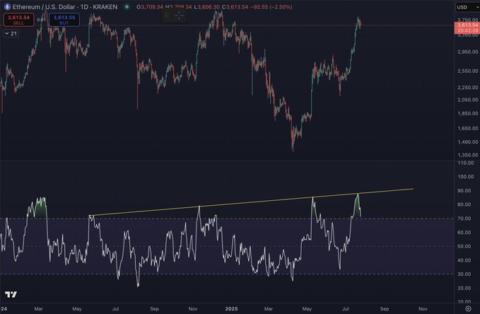 #以太幣日線相對強弱指標在88左右被拒絕。 我不建議使用相對強弱指標來判斷更大趨勢何時結束,但有時可以用來猜測市場需要冷卻的時候。