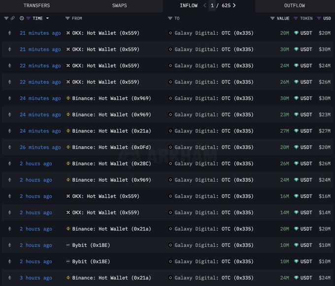 🚨銀河數字是否剛剛拋售了10,000枚比特幣? 銀河數字可能已經拋售了價值12億美元的比特幣,並且在僅3小時內從OKX、幣安和Bybit提取了3.7億USDT。 比特幣下跌3%……這是原因嗎?🤔