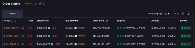 「LUNA/UST 崩盤時做空 $BTC 賺取 516 萬美元的聰明錢」再次入場,這次標的是 WBTC😎 過去半小時他花費 948.5 萬美元買入 80.2623 WBTC,均價 $118,174,遠古巨鯨拋售的利空落地,看來這位聰明錢是看好後市表現了 錢包地址 explorer.cow.fi/address/0xdfcA...… 本文由 #Gate 大門交易所 | @Gateio_zh 贊助