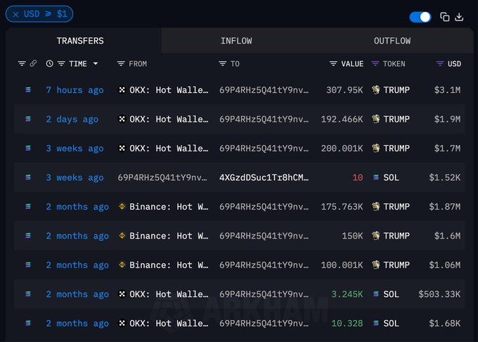 TRUMP 個人 / 機構持倉 TOP2 地址竟然還在加倉,距離 TOP1 只有 24.5 萬枚的差距了🤨 地址 69P4R...BhYLQ 和 2p63s...ePVxu 累計持有 2,424,094 $TRUMP ,價值 2467 萬美元,其平均成本約為 $10.19,當前幣價基本和成本持平;而該地址 7 小時前還在加倉,從 #OKX 中提出 30.7 萬枚代幣(310 萬美元) 錢包地址 intel.arkm.com/explorer/addres...… intel.arkm.com/explorer/addres...…