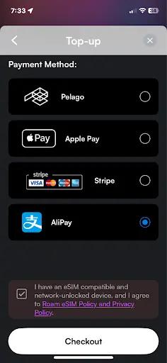支持綁定信用卡自動續費,也支持支付寶、 USDC/USDT等支付方式,即將開通 ROAM 代幣充值,多種途徑確保通信服務始終在線。