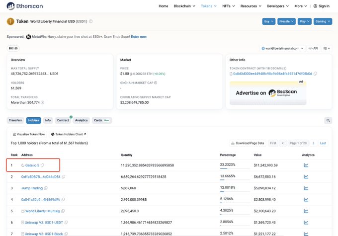 因為 Gate 的 Launchpad 打新本期支持 USD1 投入,大量的 USD1 流入 Gate。目前 Gate 成為了 USD1 持有量第二的交易所,僅次於 Binance。