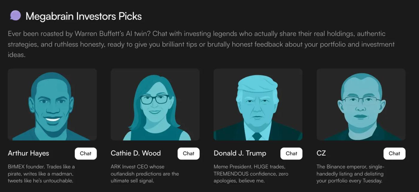 跟死板的報告或長篇分析比,Megabrain投資巨擘功能讓你能快速對比不同“大佬”的看法。問同一個問題,你能看到巴菲特的謹慎和特朗普的激進有和不同,或者V神的細膩跟CZ的務實怎麼碰撞。
