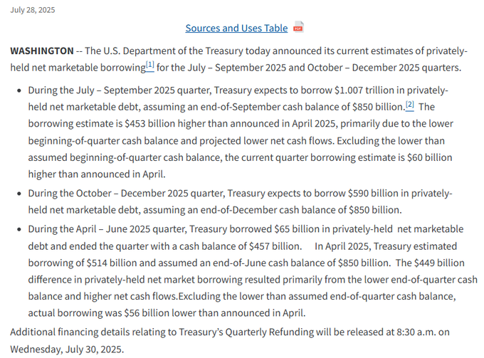 Lyn Alden07-29本文為機器翻譯展示原文Treasury釋出了其借款估算。 在接下來的兩個季度中將發行1.6萬億美元的淨新債務。其中約5000億美元是TGA的補充。來自推特免責聲明:以上內容僅為作者觀點,不代表Followin的任何立場,不構成與Followin相關的任何投資建議。喜歡收藏 評論分享相關推薦PANews交易時刻:白銀新高後跳水,機構預警貴金屬回調風險,比特幣呈“死貓反彈”?BTC0.02%BeInCrypto Việt Nam芝加哥商品交易所的最新舉措令交易員擔憂:為什麼週一對於白銀價格如此重要。BeInCrypto Việt Nam2026年1月3個值得關注的meme幣