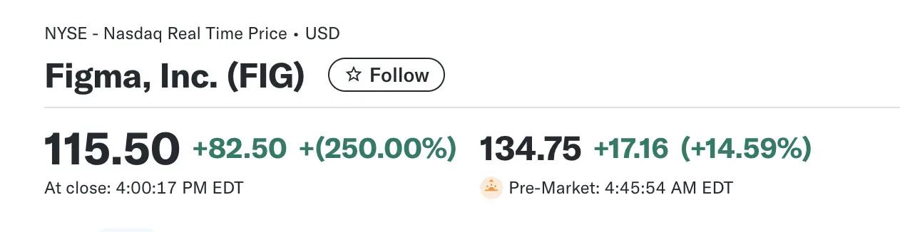 此外,Figma上市首日暴漲250%,股價一度飆升至129美元,完全稀釋市值突破480億美元,創造了2025年科技IPO史上最強首日表現之一!