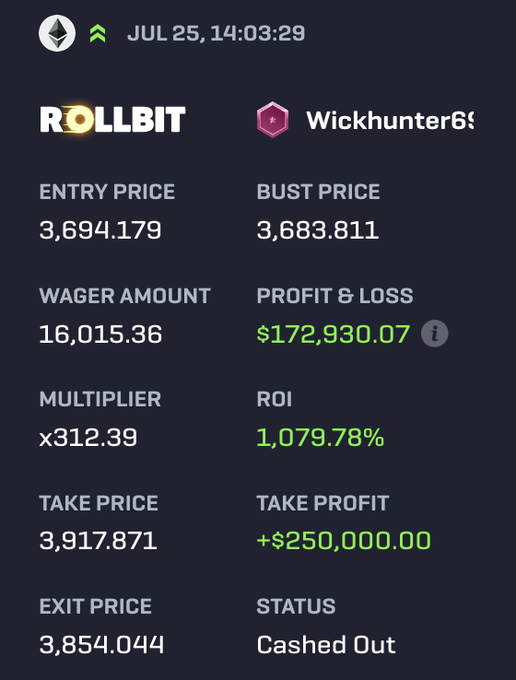 臥槽?! 這傢伙在3694點對E太做多312倍,並在3854點止盈 如果以太幣從他的入場價跌了10美元,他就會全部虧光 以太幣在3900點上方觸頂,現在正在3450點交易 僅僅透過精準把握市場時機,從1.6萬美元變成了17.3萬美元的損益 好遊戲