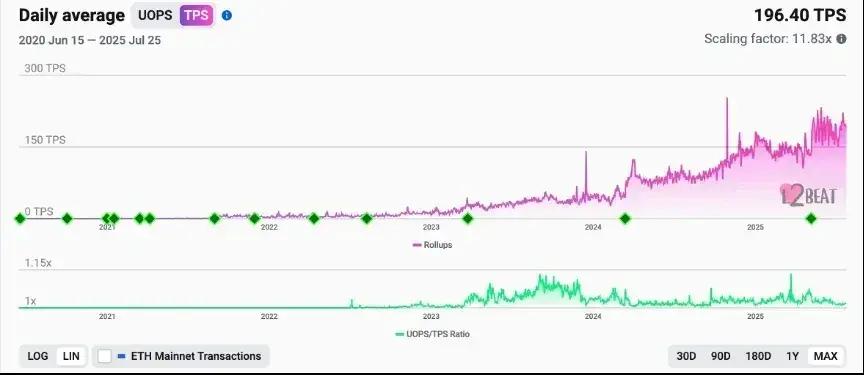 前面提及,之前以太坊的 TPS 是 15/s,那現在以太坊生態整體實際的 TPS 是多少呢?