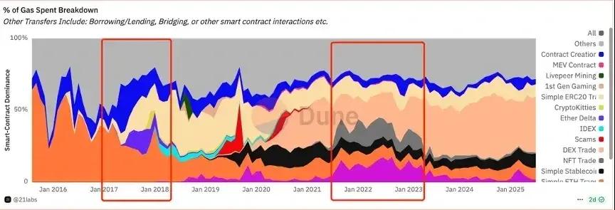 通過歷史數據可以看到,藉助 Gas 消耗量來分析,在 2017-2018 年,產生裡大量的合約(圖中左側紅框中黃色部分),並且 ERC 20 的 Transfer 也熱門起來,鏈上資產的類型,從原生幣(ETH)轉化為多種多樣的生態應用。