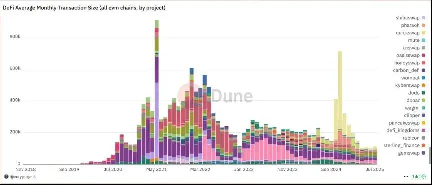 這張圖,可以看到的是各類 EVM 架構鏈上的 Defi 類應用交易的趨勢,雖然有些 EVM 並不是以太坊以及其 L 2 生態,但可以由此看到從 21 年最顛覆時期,幾大群雄逐鹿到如今,已經看不清有多少的顏色(項目)在各個鏈上,各自開花滿足著不同鏈上多元的金融需求。