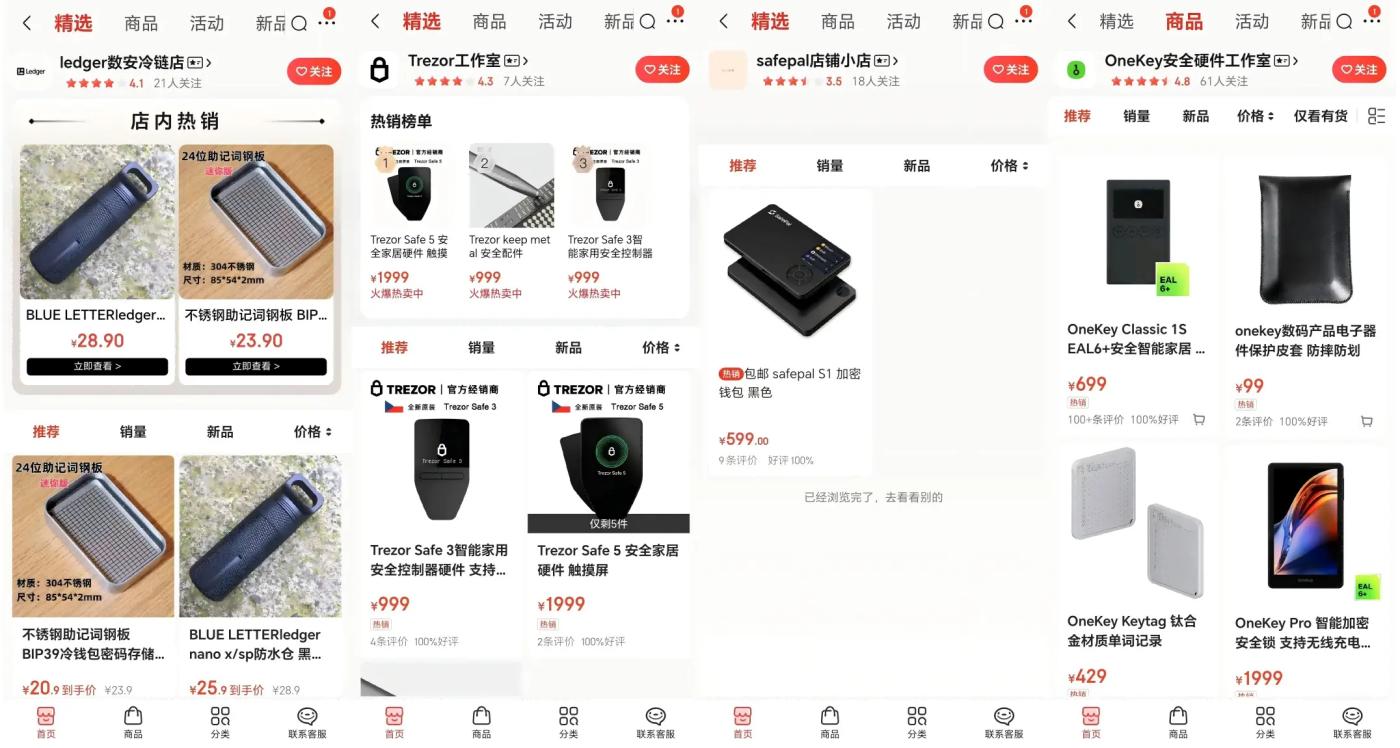 其中尤以抖音平臺最全,Ledger、Trezor、SafePal、OneKey、imKey 均有店鋪銷售。