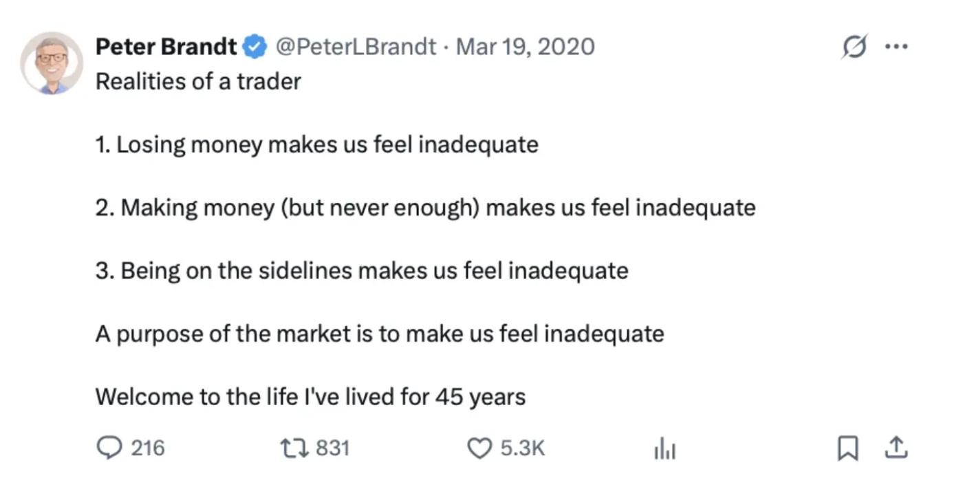 自 1975 年進入商品交易市場以來,Peter Brandt 已經活躍近半個世紀。在推特上,他擁有超過 80 萬名追隨者。經濟學家、《華爾街日報》專欄作家 Barry Ritholtz 更將他評為「金融行業最具影響力的30人」之一。