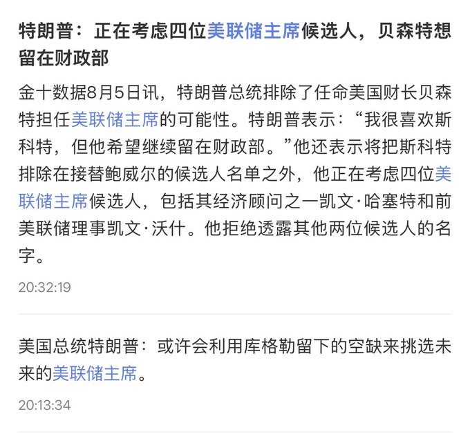 需要关注8月8号美联储理事库格勒辞职正式离任后川普提名的理事人选,很有可能也就是下一任联储主席人选。鲍威尔美联储主席的任期是26年5月结束,但其美联储理事任期是到28年1月结束。原则上鲍威尔主席任期结束后,还是可以继续担任美联储理事只要他还想继续理事任期。而要担任美联储主席的人首先应该已 x.com/qinbafrank/sta…