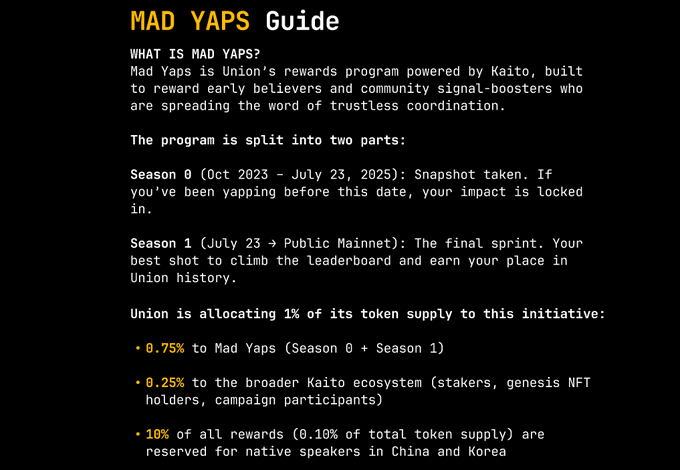 📢 @union_build 瘋狂的Yaps正在四處蔓延。 我只是一個旁觀者……但感覺就像是在web3版的《瘋狂的麥克斯》中迷失。 經驗豐富的Yappers毫不猶豫地加入。 新手?不要慌。你並不孤單。 整個Yaps的土地都在等待你。 🗺️ 以下是如何Yaps的詳細指南: 👉 Yapper指南2025 figma.com/deck/cmn8cdabqhhXoR9...… 生存技巧: - 快速Yap,乾淨地Yap,在正確的地方Yap。 - 不要隨機發送寄生蟲,否則你很快就會被淘汰。