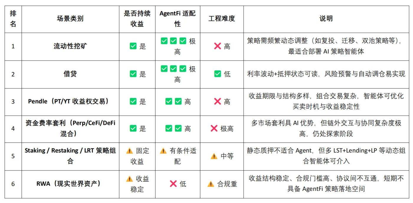受限於收益期限、波動頻率、鏈上數據複雜度、跨協議整合難度及合規限制等多重因素,不同收益類場景在 AgentFi 維度的適配性與工程落地性存在顯著差異,優先級建議如下: