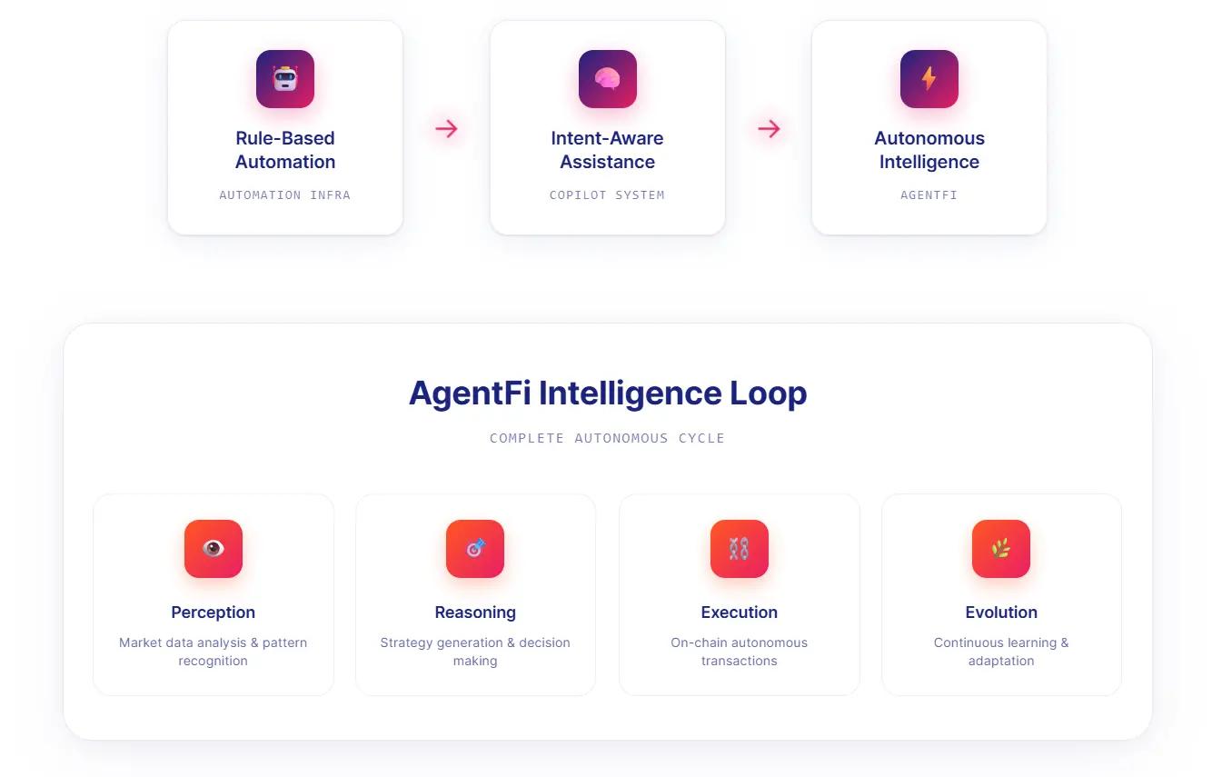 AgentFi 則代表完整的“感知 → 推理/策略生成 → 鏈上執行 → 演化”智能閉環,是具備鏈上自治執行與持續演化能力的智能體(Agent)。