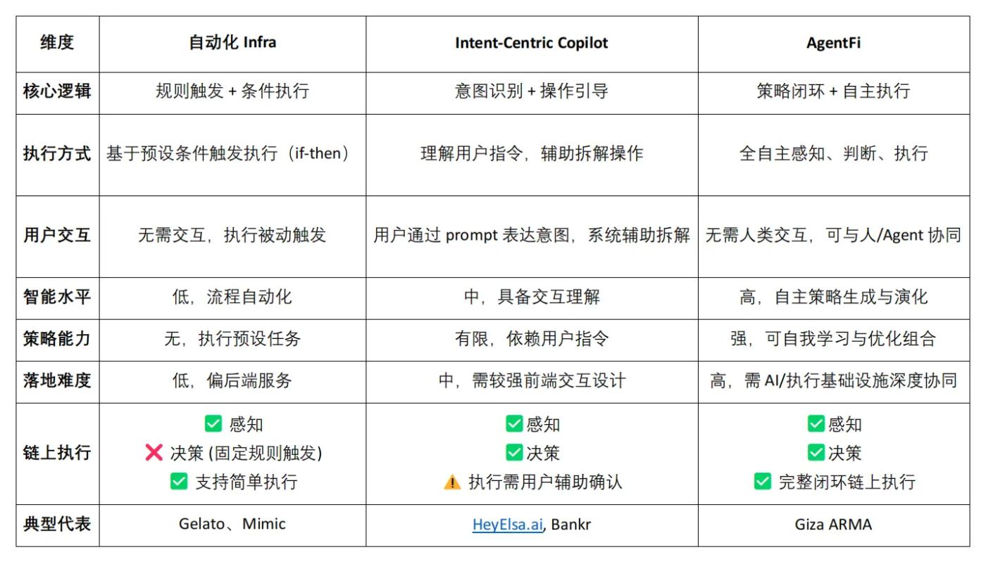 在 DeFi 智能化的演進中,我們可以將系統能力劃分為三個階段:Automation(自動化工具)、Intent-Centric Copilot(意圖驅動助手) 與 AgentFi(鏈上智能體)。