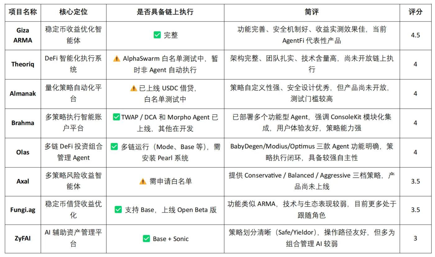 第三階段是“AgentFi 智能體”, 標誌著策略閉環與鏈上自主執行的形成。Agent 能基於實時市場狀態、用戶偏好與策略邏輯自動完成感知、決策與執行,真正實現 7×24 小時非託管的鏈上資金管理。與此同時,AgentFi 在無需用戶對每一步操作進行逐一授權的前提下,便可自主管理用戶資金,這一機制引發了關於安全性與信任機制的重大討論,亦成為 AgentFi 設計中不可迴避的核心問題。代表項目包括 Giza ARMA、Theoriq AlphaSwarm、Almanak、Brahma等,均已在策略部署、安全架構與產品模塊上具備一定落地能力,是當前 DeFi 智能體方向的中堅力量。