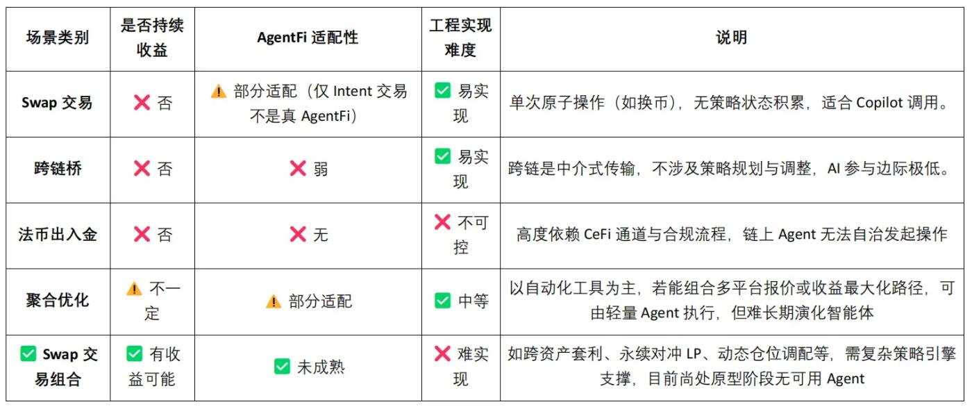 資產流通與交換類場景以原子化交互為主,包括 Swap交易、跨鏈橋、法幣出入金等,其本質特徵為“意圖驅動 + 單次原子化交互”,交易過程不涉及收益策略、狀態維護與演化邏輯,大多適用於 Intent-Centric Copilot 的輕量化執行路徑,並不屬於 AgentFi 。