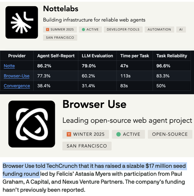 - Nuit 的直接競爭對手 BrowserUse(Y Combinator 2025 冬季孵化)上個月融資 1700 萬美元