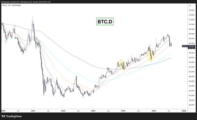這是BTC.D首次在經歷陡峭下跌後未能反彈的週期。 自2023年初以來,那個50周指數移動平均線一直被尊重,現在看起來它想要跌破這個水平。 ETH的Treasury公司主要負責,因為他們正試圖儘快將ETH推至4000美元水平。 因此,演算法正在對替代幣全面發力並捕捉這一訊號。