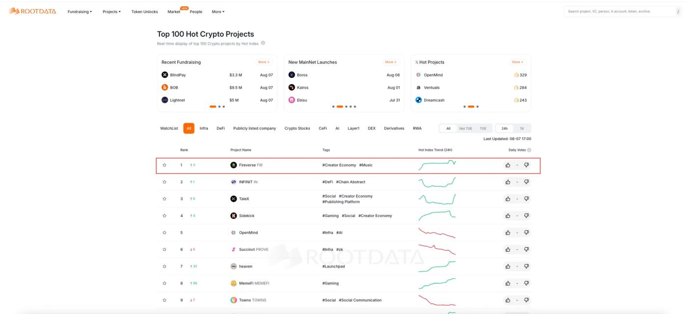與此同時,Fireverse在老牌數據分析平臺RootData的熱度榜上強勢登頂,展現出無與倫比的市場號召力和用戶關注度。RootData作為業內公認的權威數據平臺,以其全面、精準的鏈上數據分析和項目評估而聞名,其熱度排名基於多維度算法,綜合考量項目的鏈上交易活躍度、社區參與度、社交媒體聲量以及市場表現等關鍵指標,力求客觀反映項目的真實影響力和發展潛力。Fireverse能夠在這一嚴謹評選中脫穎而出,熱度飆升勢如破竹,進一步印證了其在全球行業中的強勁勢頭和廣泛認可。