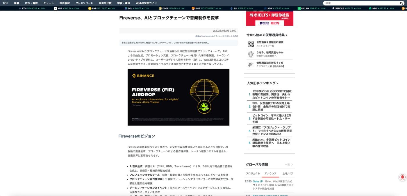 而在歐美,Fireverse 以“AI + 音樂 + Web3”的獨特定位快速吸引了創作者、投資人及音樂圈的注意。英語區社交平臺上,KOL 自發拆解項目亮點、分析代幣潛力,形成持續的二次傳播熱潮;日本市場的反應同樣火熱,日本頭部區塊鏈媒體第一時間發佈深度報道,當地 KOL 持續跟進發聲,使“Fireverse”關鍵詞在日本加密圈屢次衝上熱度榜單,甚至延伸到音樂與潮流文化圈層,帶來了額外的破圈效應。
