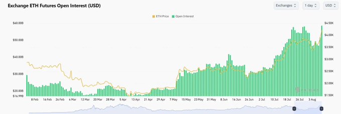 E家軍集合,雖然突破4000了,但是也要注意槓桿不要太大 據 Coinglass 數據顯示,全網以太坊期貨合約未平倉頭寸再度突破 580 億美元,創下 585.4 億美元的歷史新高。7 月 9 日以太坊期貨合約未平倉頭寸報 355.8 億美元,近 30 日增幅超 64.5%,近 24 小時增幅超 11.12%。 此外,全網比特幣期貨合約未平倉頭寸現報 789.3 億美元,24 小時跌超 2.04%。