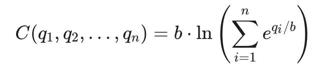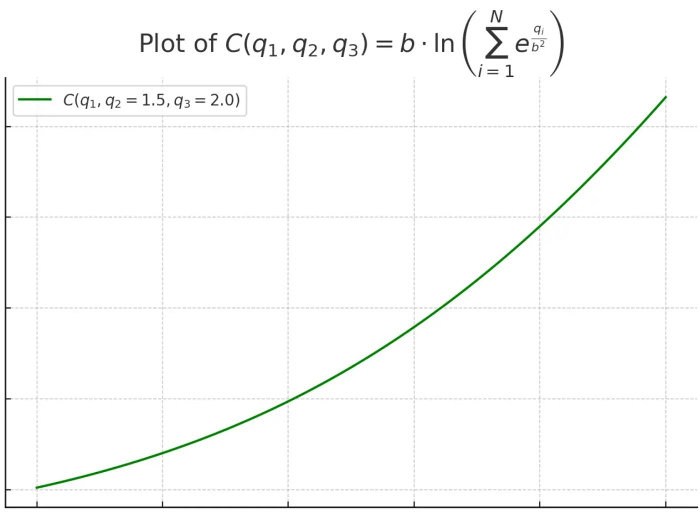 LMSR 的成本函數 C 是根據一個市場中所有可能結果的已售出份額數量來計算的。其公式為: