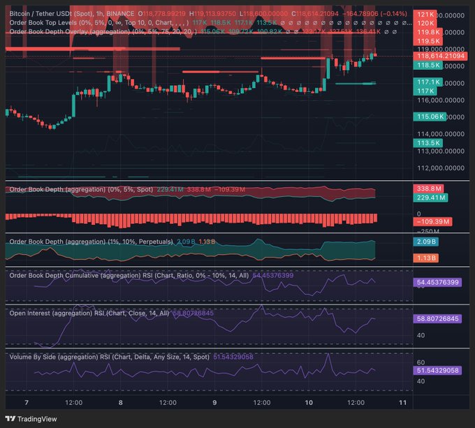 120k目標仍在考慮範圍內 指標均在正常範圍內: - ODB相對強弱指數 - 中性 - OI相對強弱指數 - 接近區域性過熱;歷史上,65以上且賣盤佔優通常會帶來0.8-1.5%的回撥 - CVD相對強弱指數 - 平衡的進攻者;目前尚無明確的市場上漲驅動 要麼118500作為回撥低點並從那裡推進至120k,要麼下探至117400-117600,然後從該區域開始下一輪上漲。
