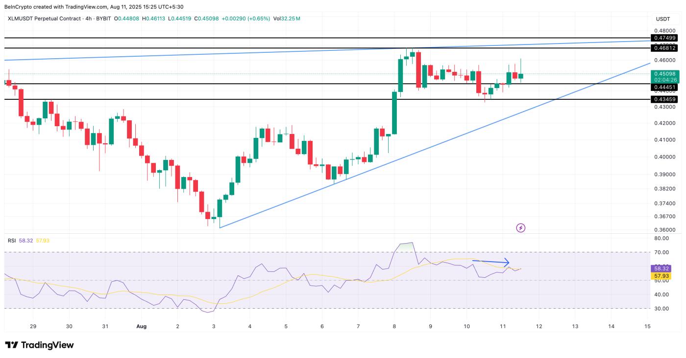 為了檢視買賣僵局是否接近打破,我們轉向4小時圖。在這裡,XLM價格保持在上升三角形內;這是一個看多的延續形態,關鍵支撐位在0.44美元,阻力位在0.46和0.47美元。