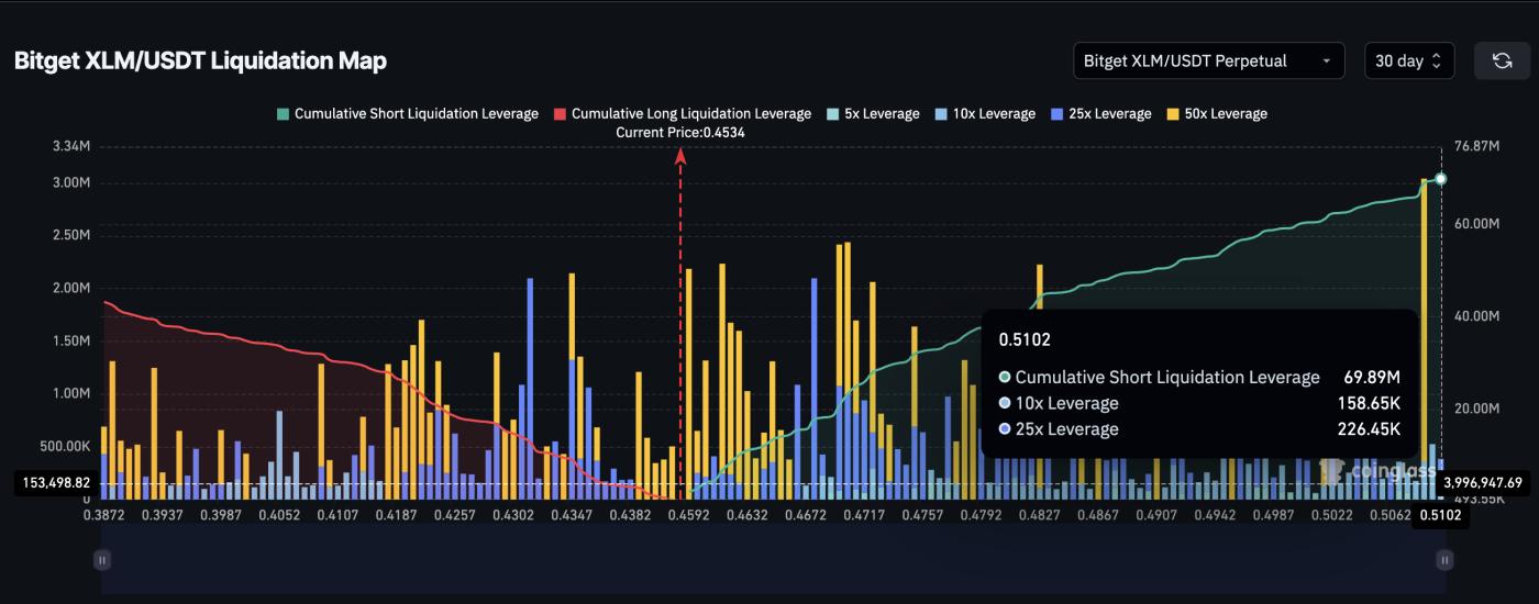 如果價格成功達到0.47美元,被平倉的做空單將能夠推動XLM價格更高,更像是級聯式拉昇。