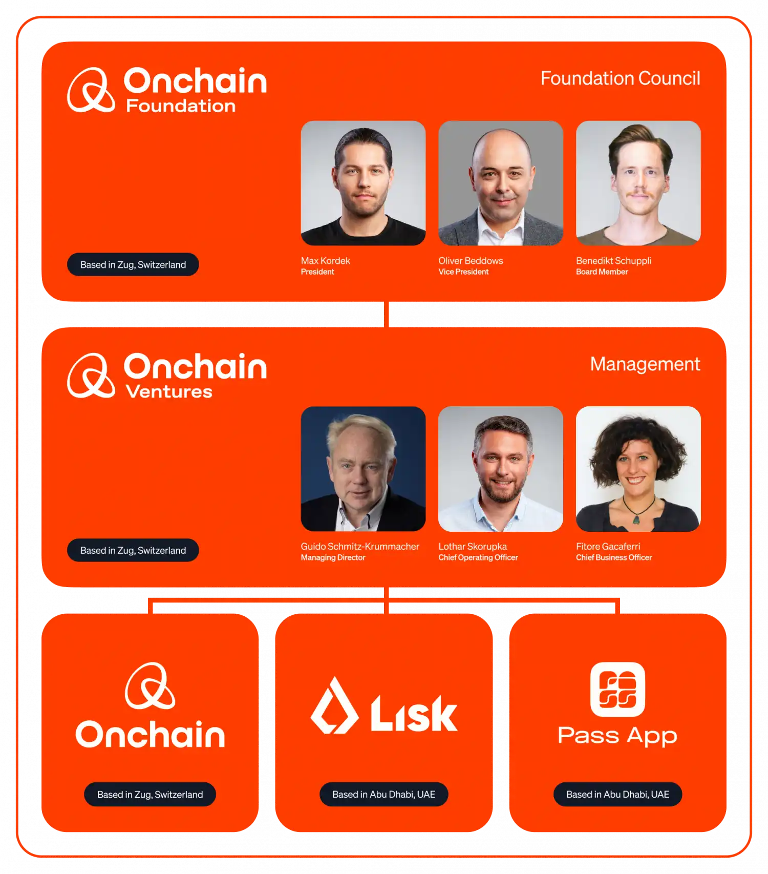 到 2022 年底,Onchain 內部研究發現,即便是大型 Layer1 基礎設施項目在商業可持續性上依然面臨挑戰。2023 年,團隊做出戰略調整,將基金會重塑為 Onchain Foundation,一個以「風險投資建設者」(Venture Builder)模式孵化多條產品線的非營利性機構。該轉型保留了原有約百人的跨領域核心團隊,並建立了 Onchain Ventures AG 作為運營部門,同時在瑞士楚格、阿布扎比等地設立針對不同業務的法律實體,實現了治理與執行的分離。
