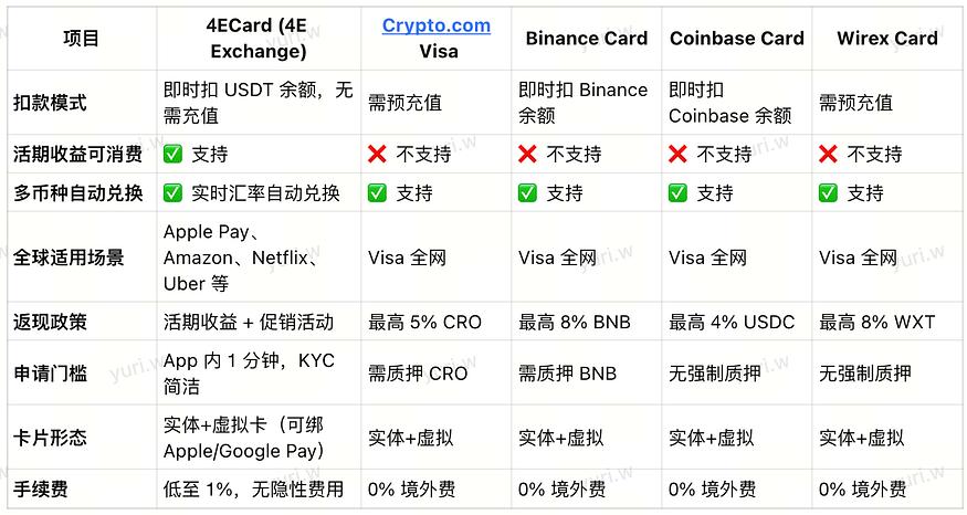 - 幣安卡:覆蓋超50個國家,支持多幣種消費,手續費透明。