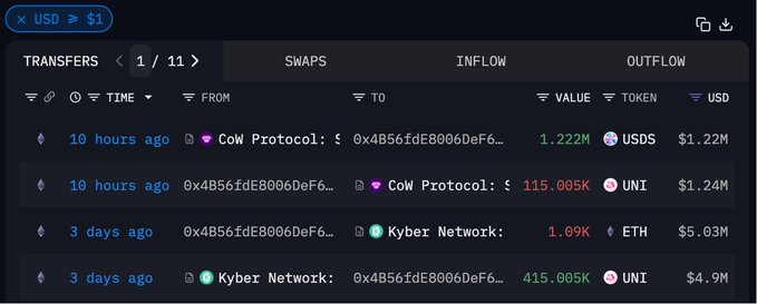 地址 0x4B5...90AFA 這是做 $UNI 波段套住了,在補倉自救啊😂 他曾在 08.13 ETH 上漲趨勢中將 1090 ETH 換倉為 415,005 UNI,隨後遇到暴跌,10 小時前再次買入 115,005 UNI 以拉低均價,累計建倉 626 萬美元的 UNI;目前平均成本 $11.82,浮虧 53.5 萬美元 錢包地址 intel.arkm.com/explorer/addres...… 本文由 #Gate 大門交易所 | @Gate_zh 贊助
