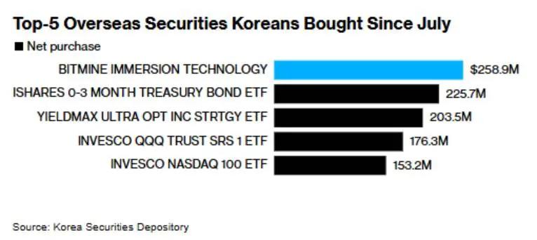 截止至8月15日,BitMine持倉ETH數量超過120萬枚,價值53億美元,甩開第二名SharpLink持倉ETH數量一倍以上。據韓國證券存管院數據顯示,自7月以來,韓國散戶已累計淨買入超過2.59億美元的BMNR,使其成為同期最受歡迎的外國證券。