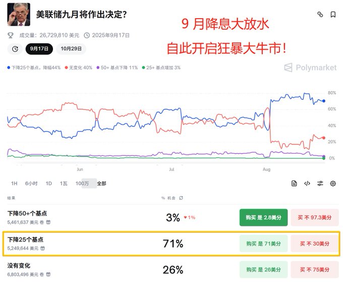 🔸9 月中旬,美聯儲降息 25 BP,在 Polymarket 上的概率是 71 %,降息然後開啟狂暴大牛市,以太坊在 10 月底衝刺 8000 美金